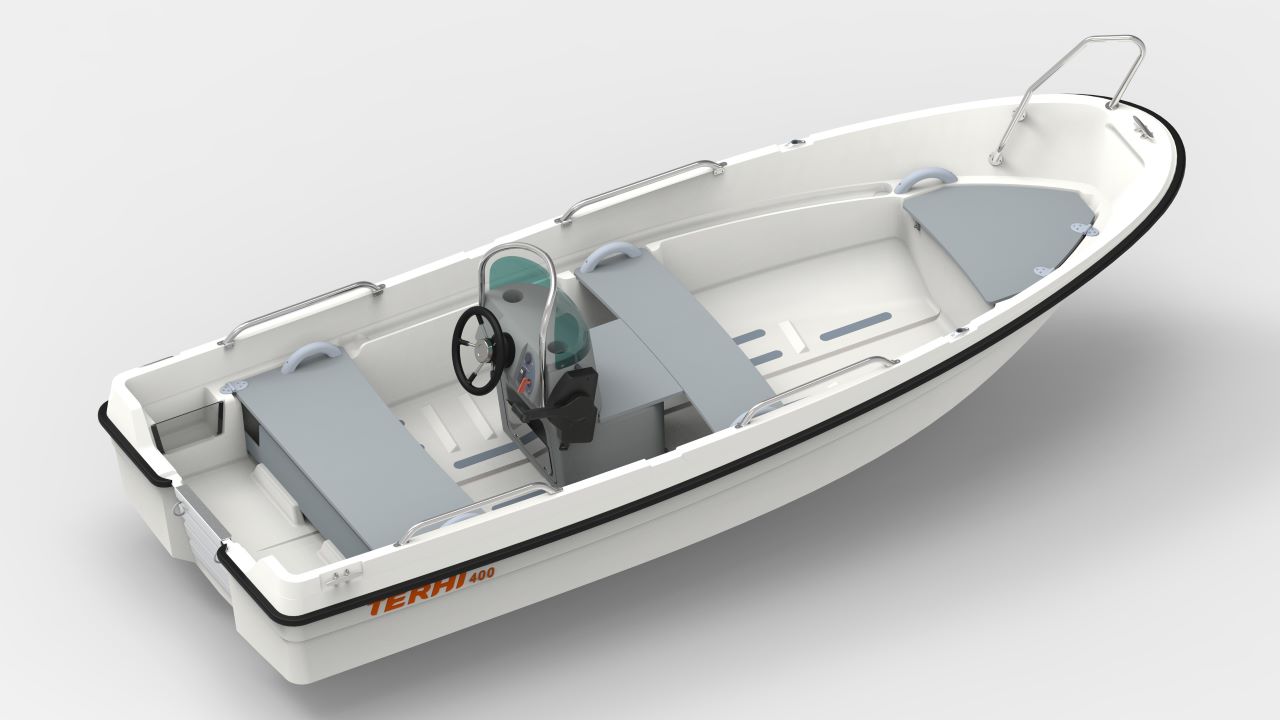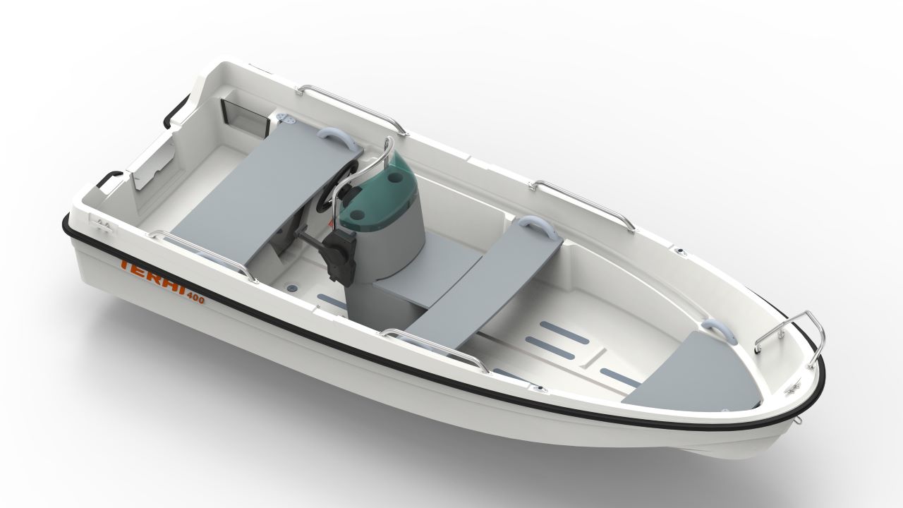 Nyheten Terhi 400 C är en planande pulpetbåt för 5-15 hk som även är bra att ro. Ungefärlig fart med 2 personer 18 knop. Dubbelskrov med regnläns. Smart fällbänk och gott om sittplatser. I standardutförande ingår årklykor och åror.