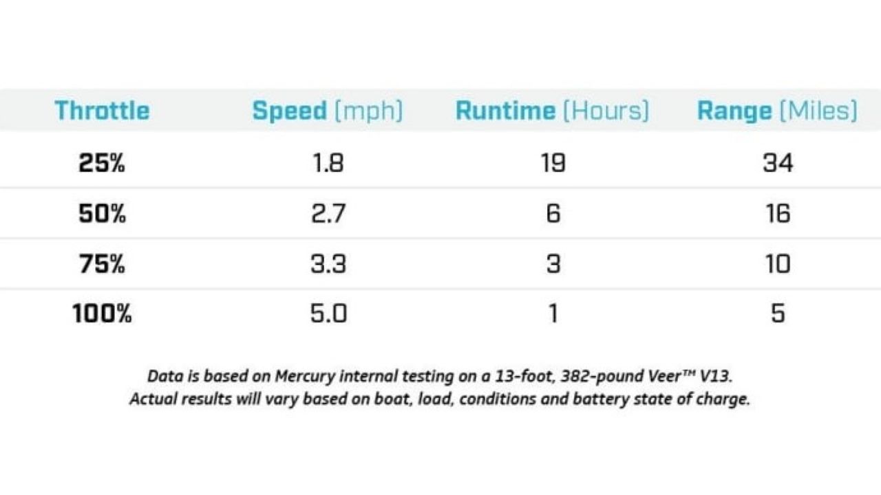 Vad betyder då 7.5e? Det är Mercurys kraftbeteckning för elektrisk framdrivning, där bokstaven"e" står förelektrisk. "7.5" hänvisar till propelleraxelns kraft - 750W. Avator 7.5e-modellen är kapabel till hastigheter och acceleration likt en Mercury 3,5 hk 4-takts förbränningsutombordare.